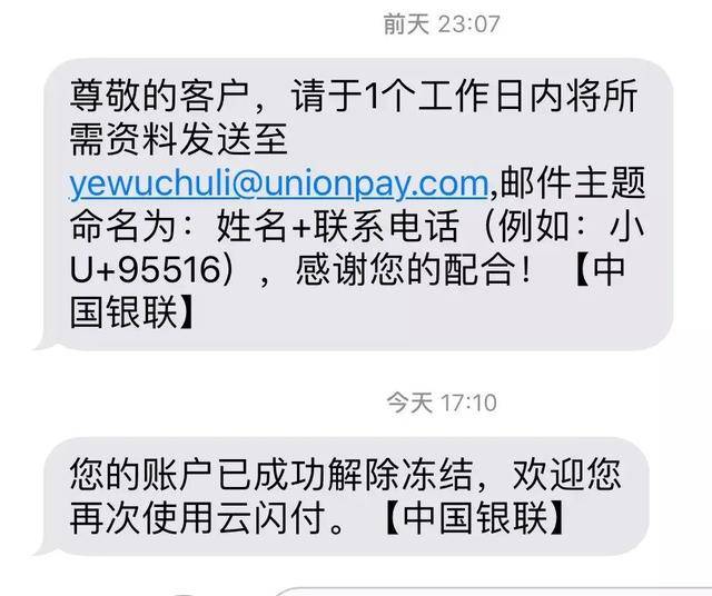 - 95516发短信给我说云闪付冻结